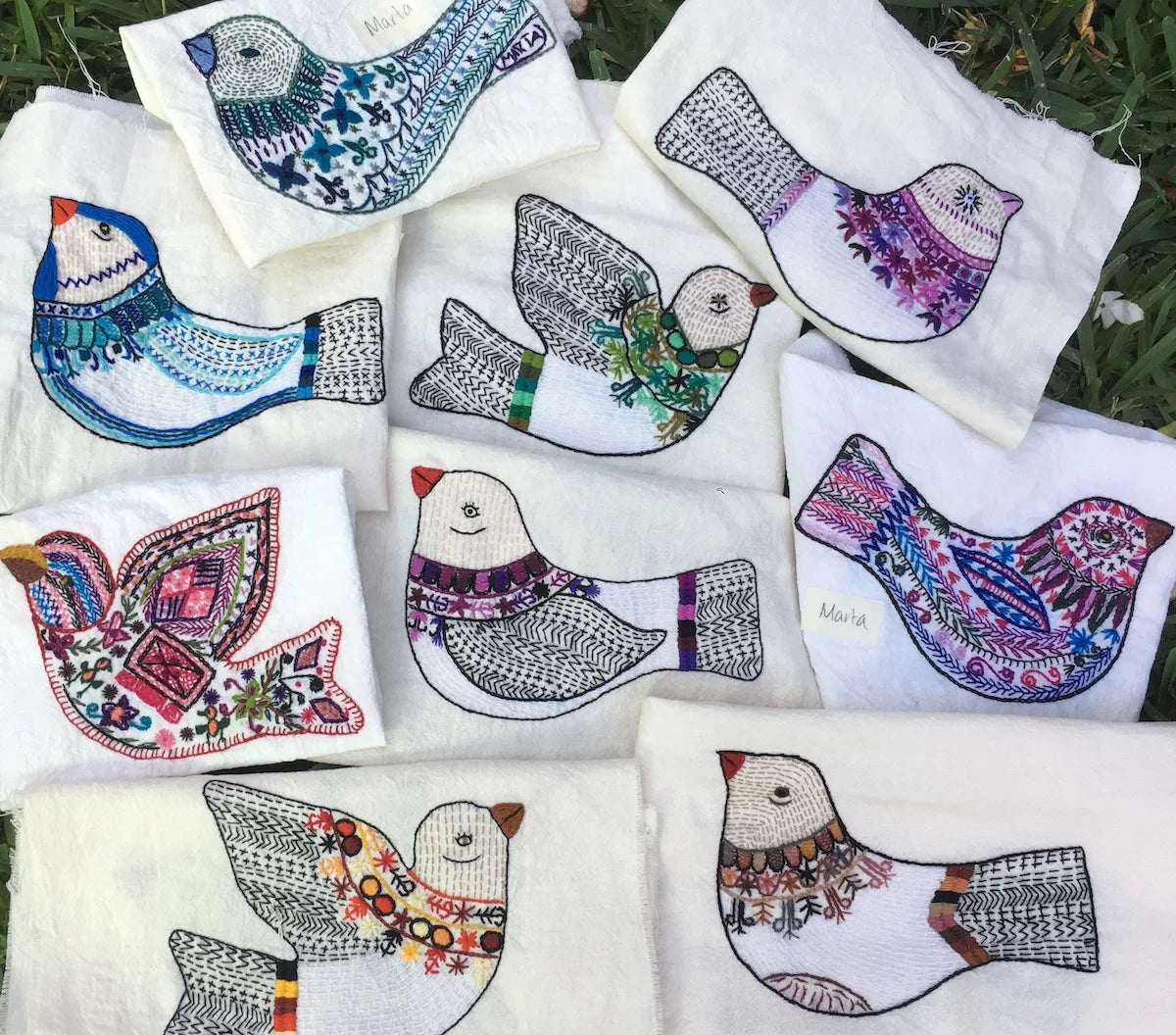 Across oceans, languages, and cultures, the embroidery artists of Multicolores retain a connection to Sarah and the talented Malagasy embroidery artists of Stitch St. Luce. Many of Multicolores’ embroidery artists have been inspired by the detailed, vibrant, and evocative Malagasy story cloths, which often depict folktales and legends.