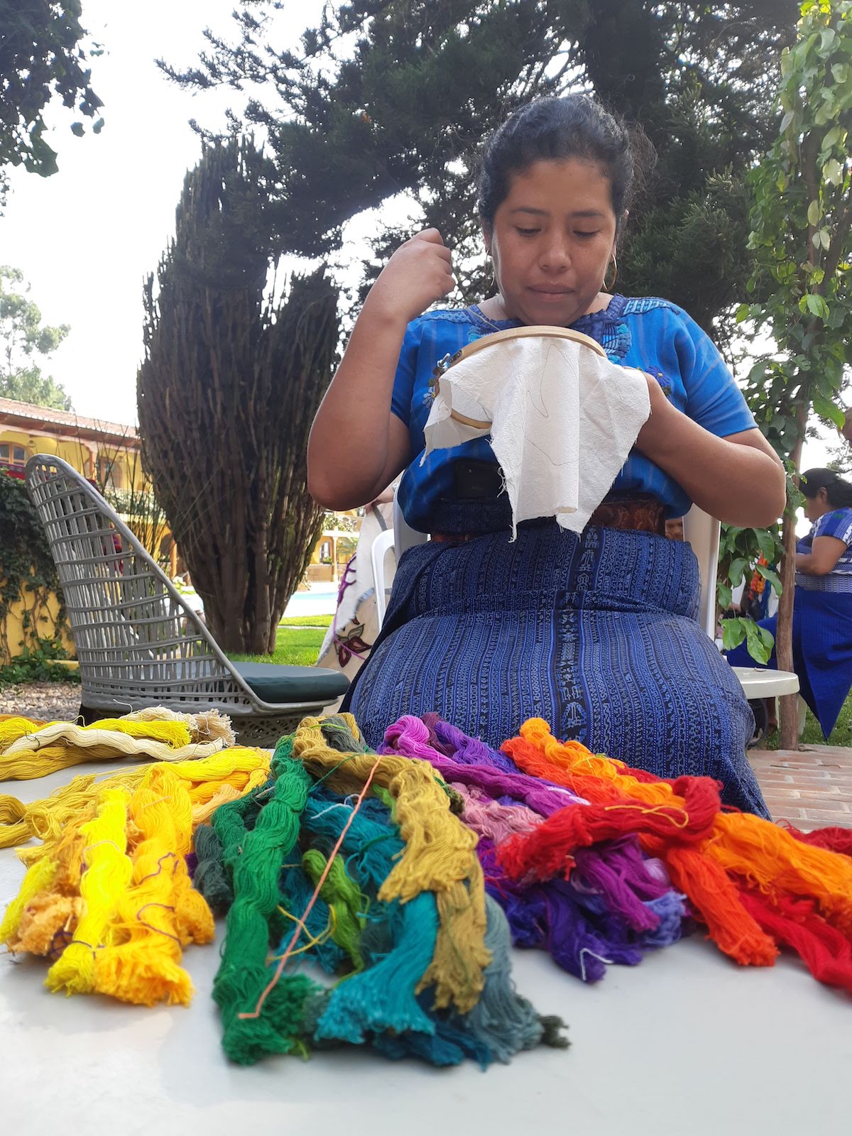 The embroidery artists use fine cotton thread on cotton base cloth to stitch their designs. They source recycled fabric from secondhand clothes to add layers of fabric appliqué. To create a rich array of skin tones, artists use fabric colored with natural dyes from our partner Flor Ixcaco, a women’s cooperative in San Juan la Laguna.