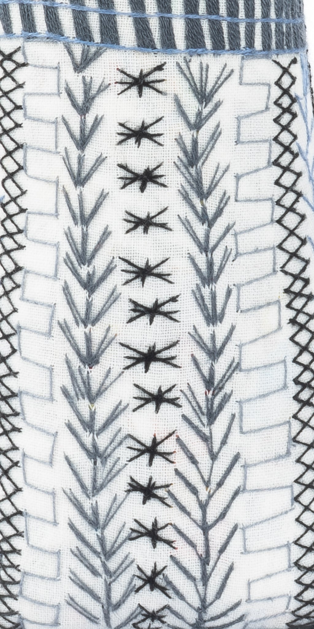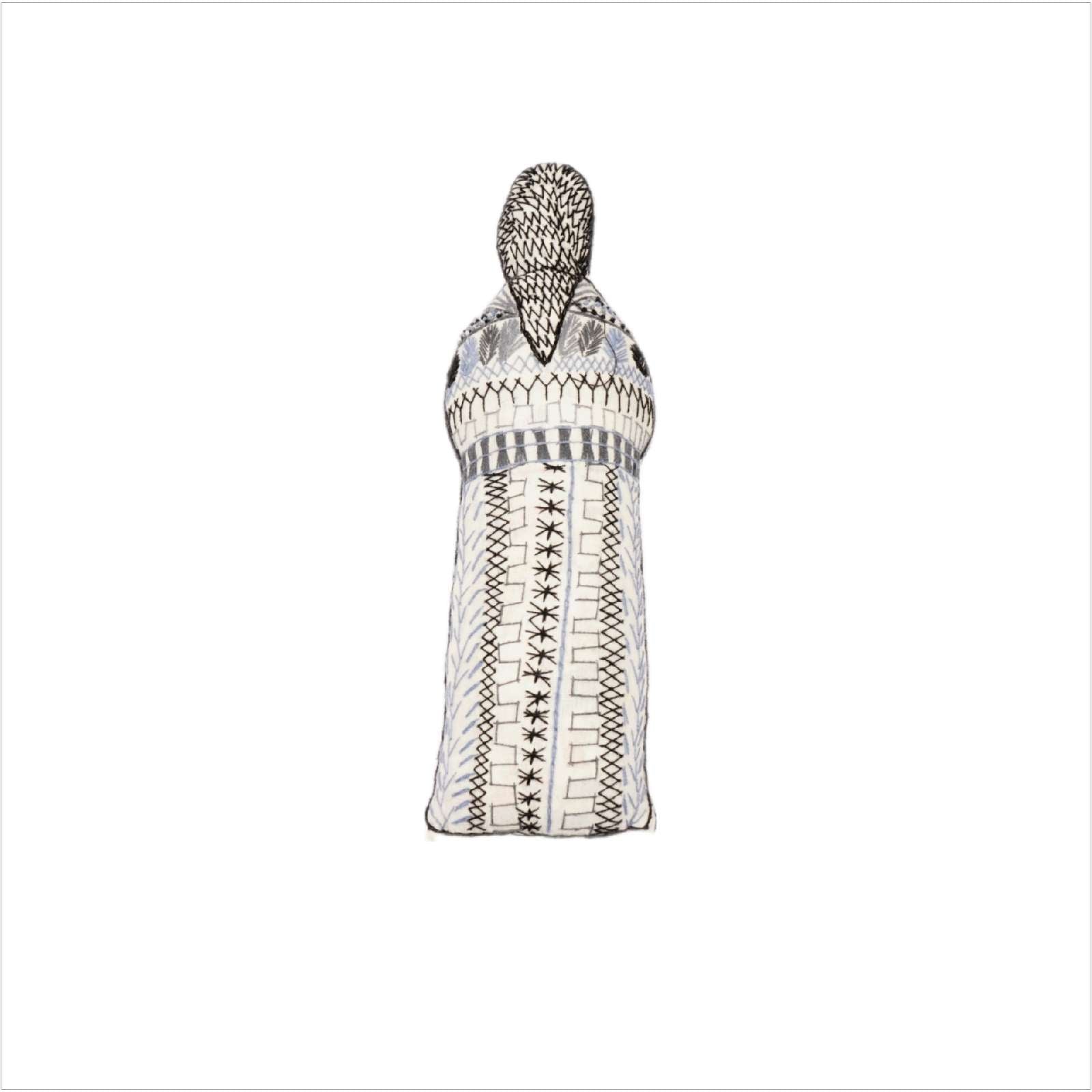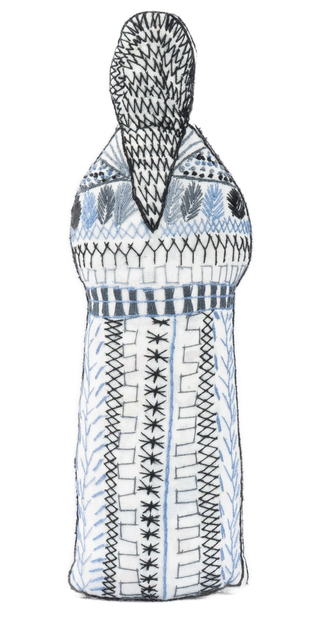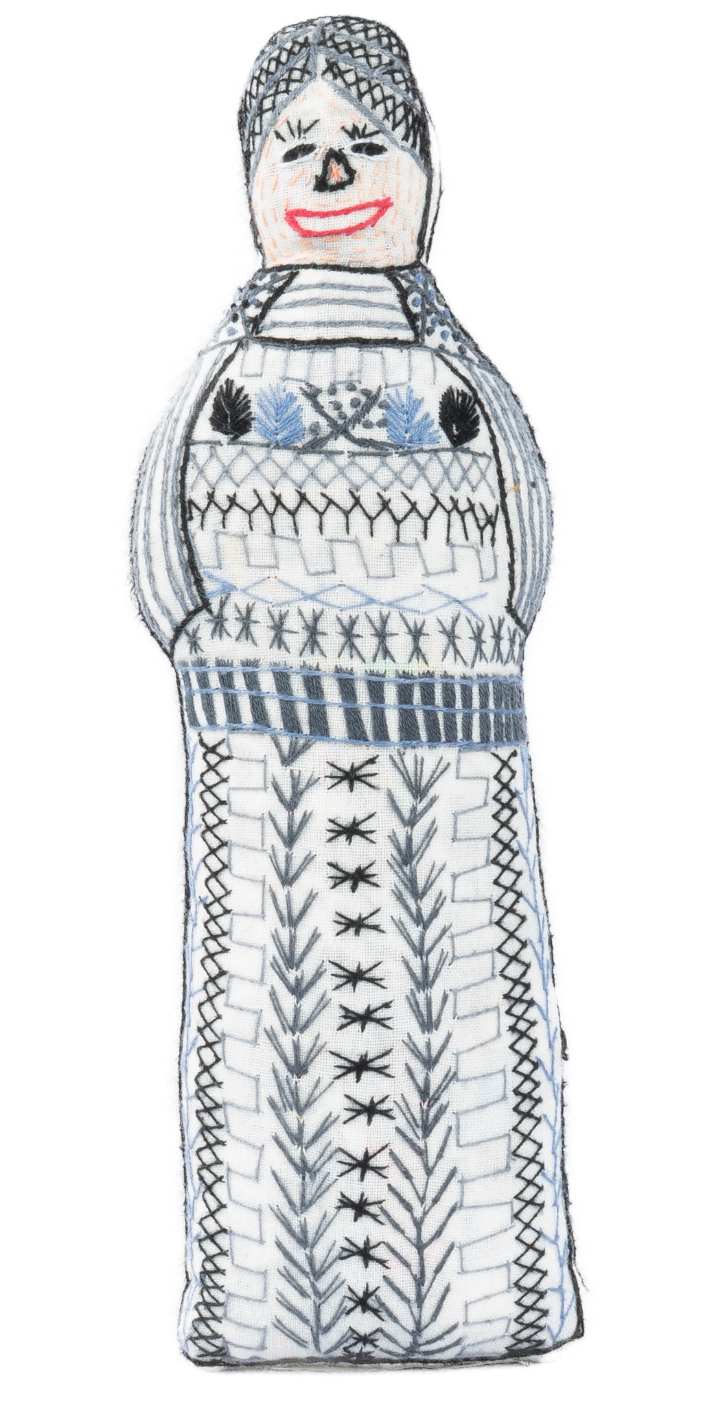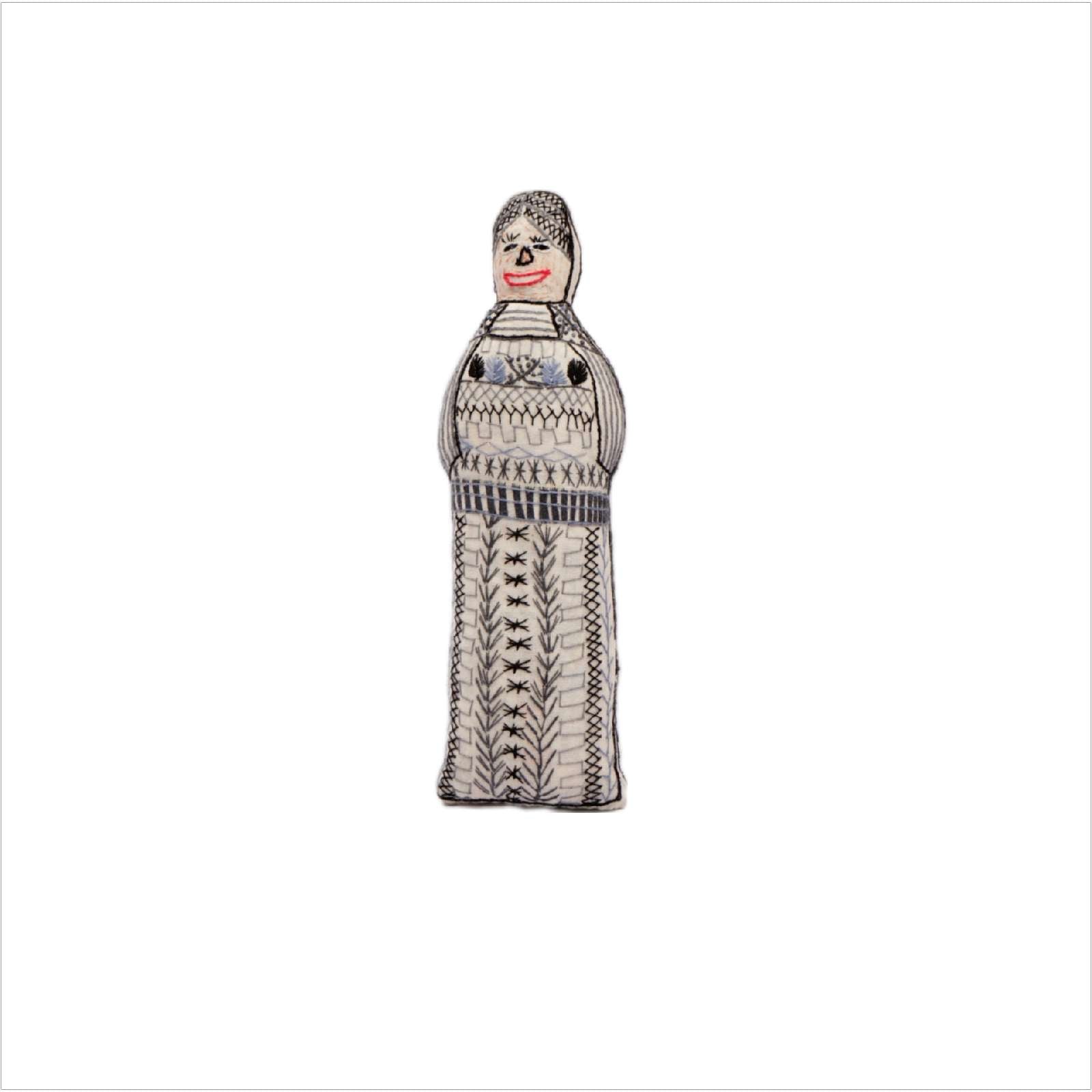 Hand embroidered doll measures 3.5 x 9 inches.