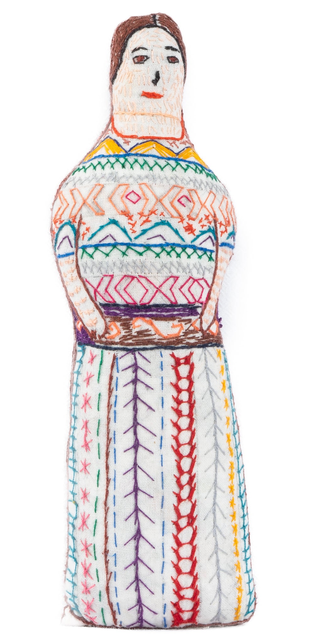 "Embroidered doll featuring designs that represent the traditional costumes of various regions of Guatemala."