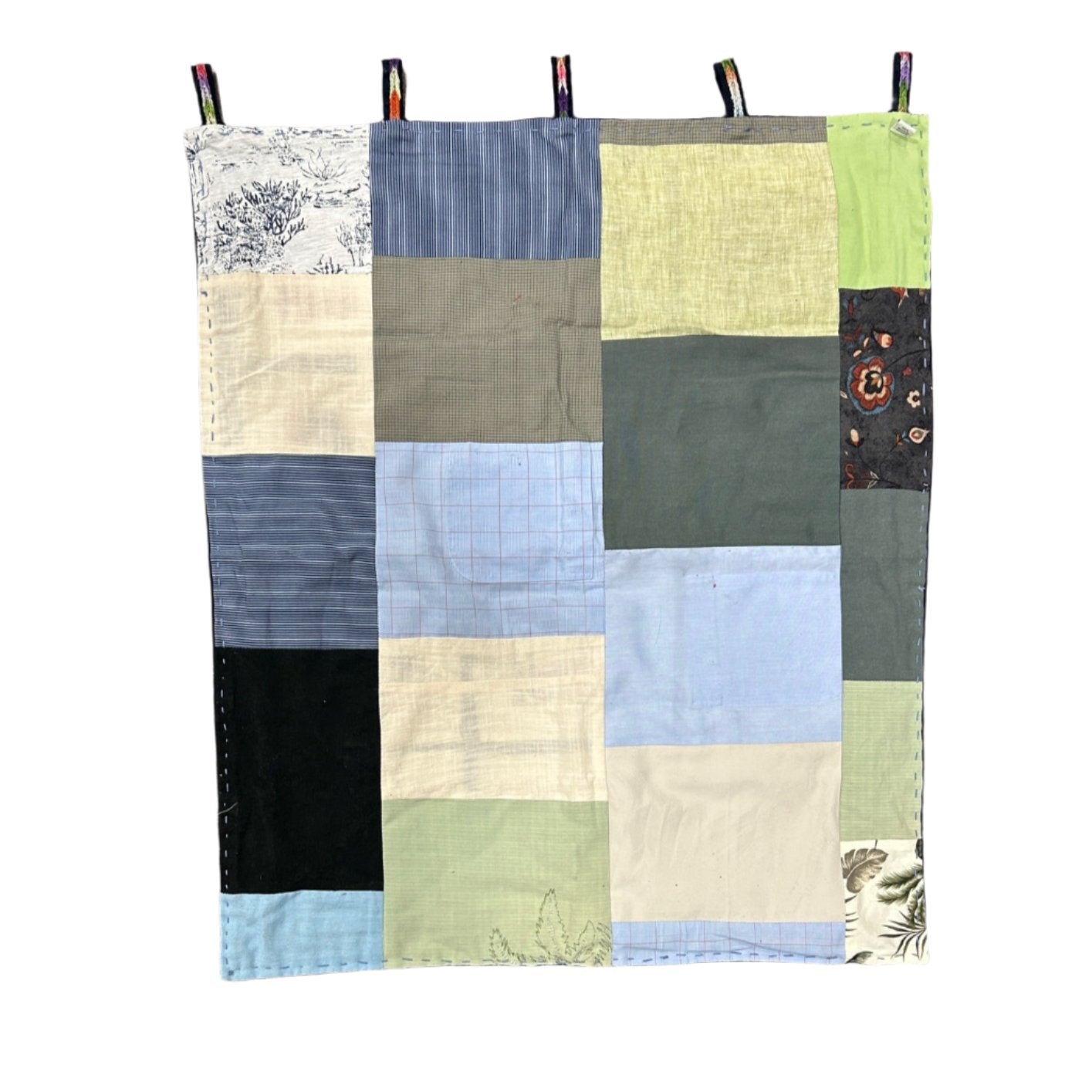 - The border is made of recycled indigo 'corte' fabric, with a system of five loops made from recycled 'corte randa' (trimming).