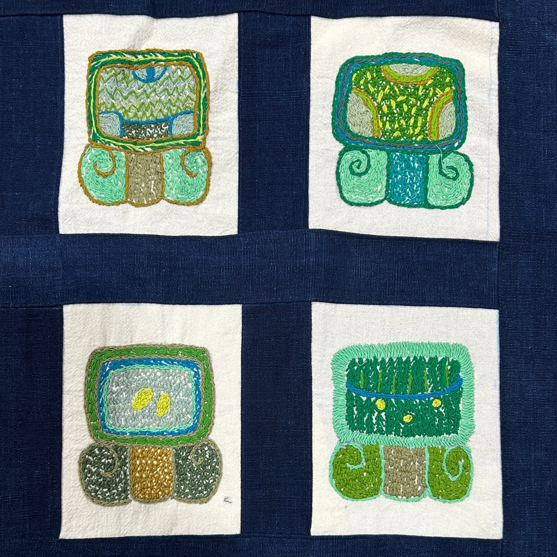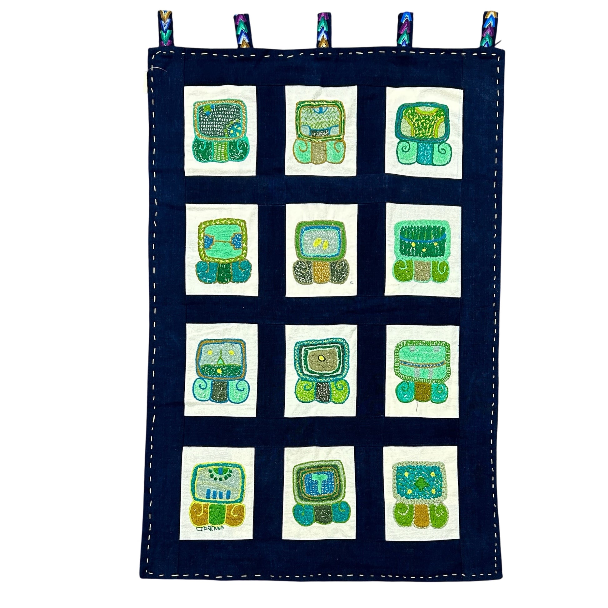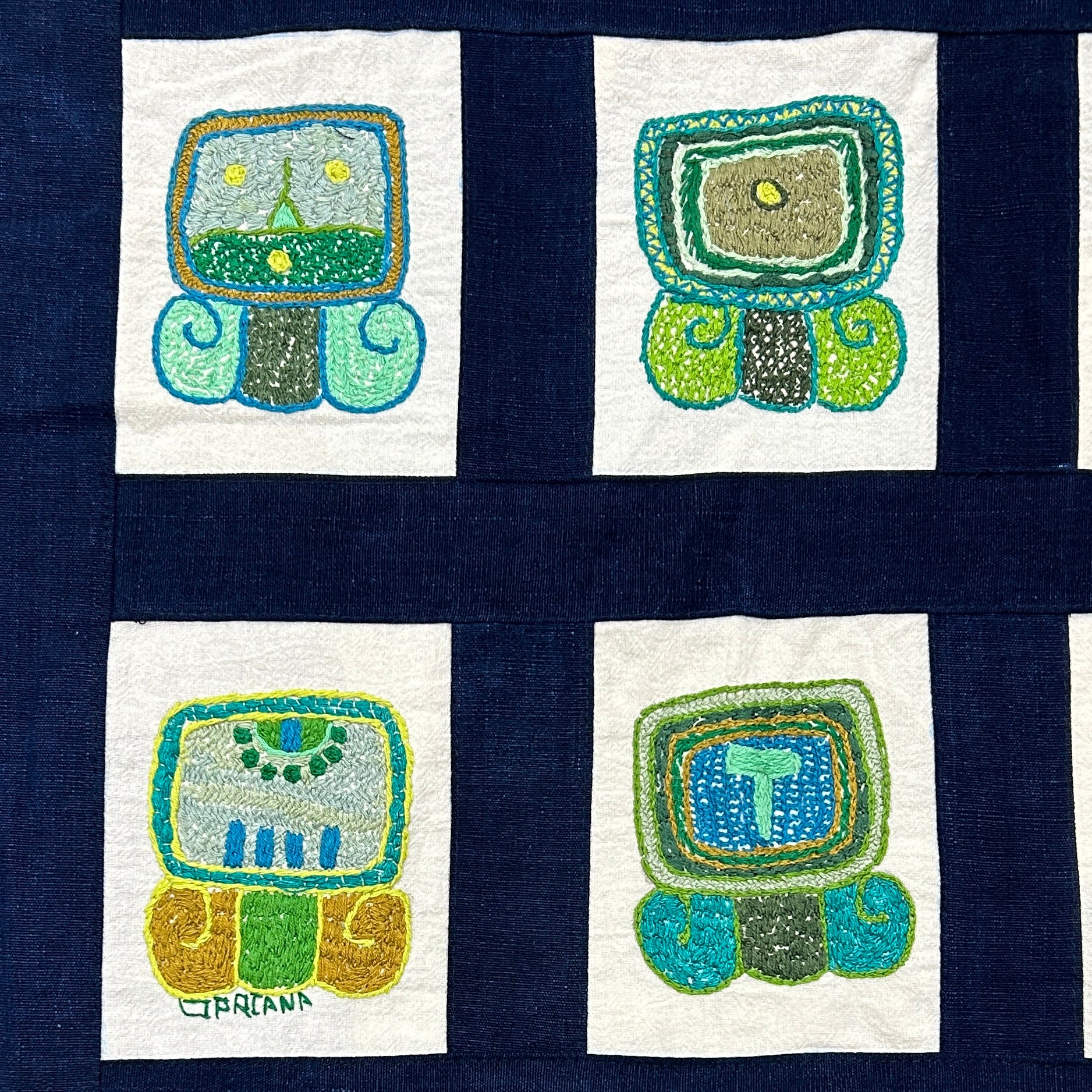 This work of art was designed and hand-stitched by Cipriana García Ajpop, member of the Totonicapán embroidery group. The 12 nahuales are finely embroidered with a variety of stitches. This is then framed on an indigo cloth. This would brighten up any wall in the home or office.