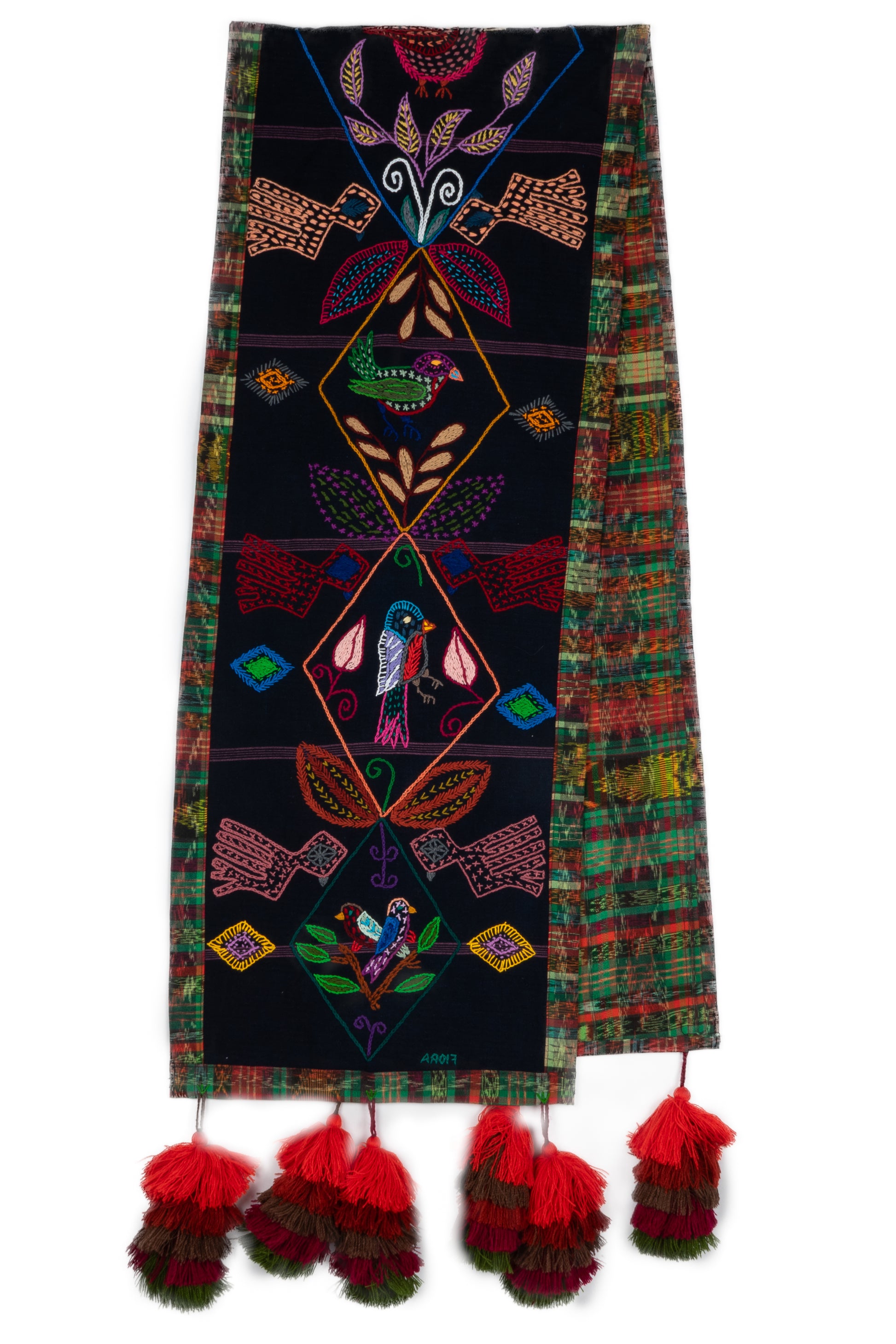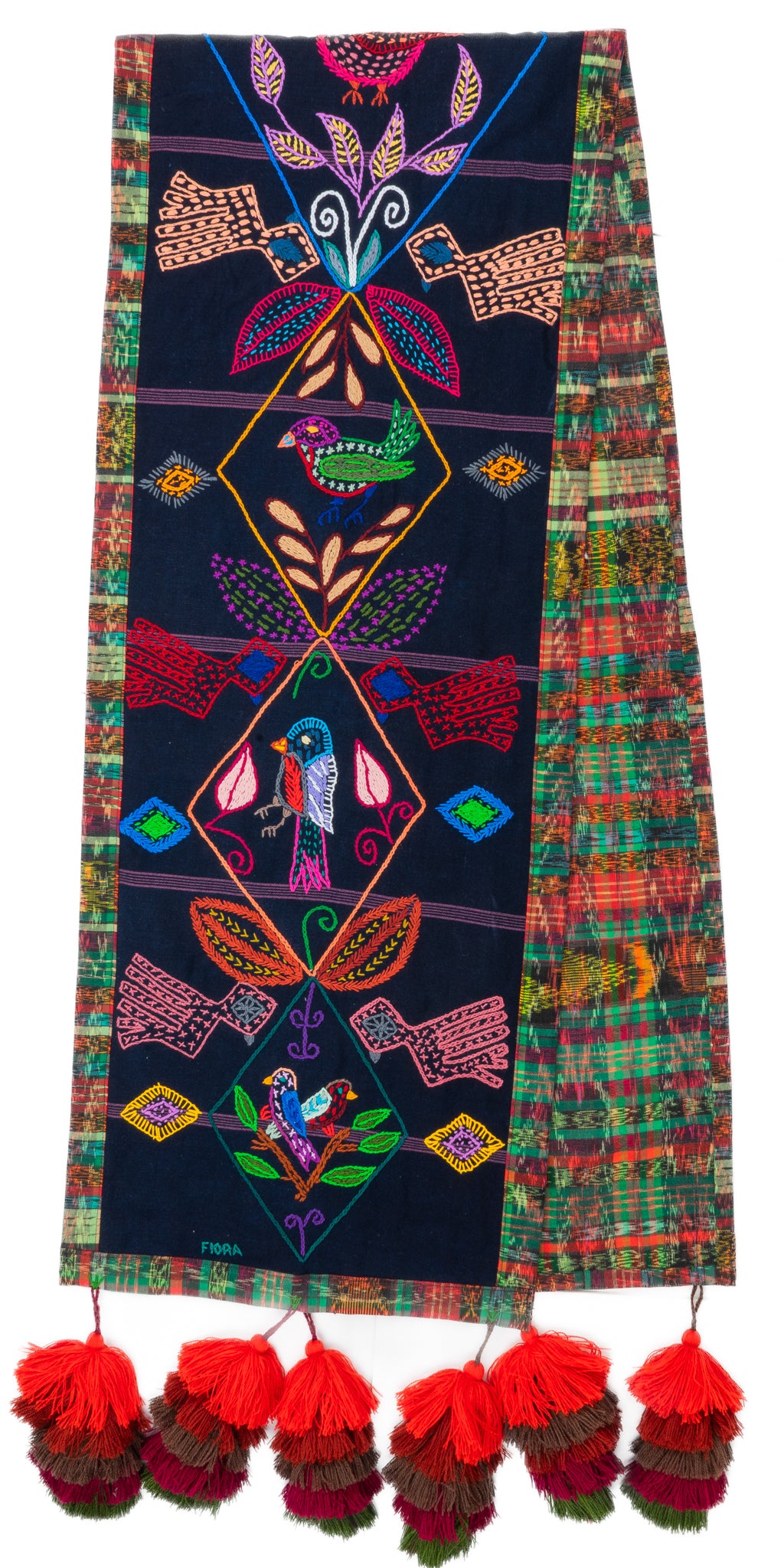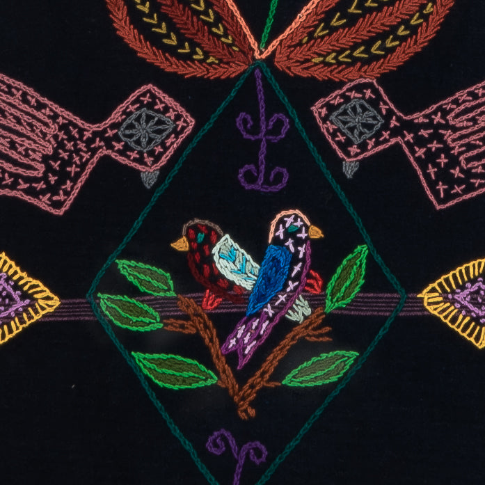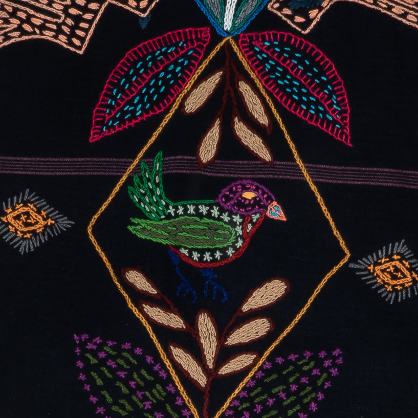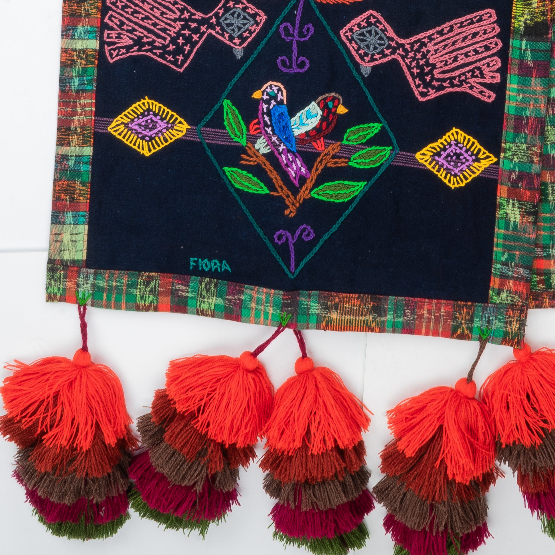 This work of art was designed and hand-stitched by Flora Tejaxún Chuy, a member of the Sumpango, Sacatepéquez embroidery group. The design is crafted with cotton thread and framed with recycled 'corte' fabric in color, adorned with pom-poms hand-made from wool.
