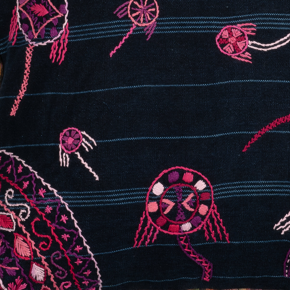 This work of art was designed and hand-stitched by Ana Berta Cubur Gil, a member of the Sumpango, Sacatepéquez embroidery group.