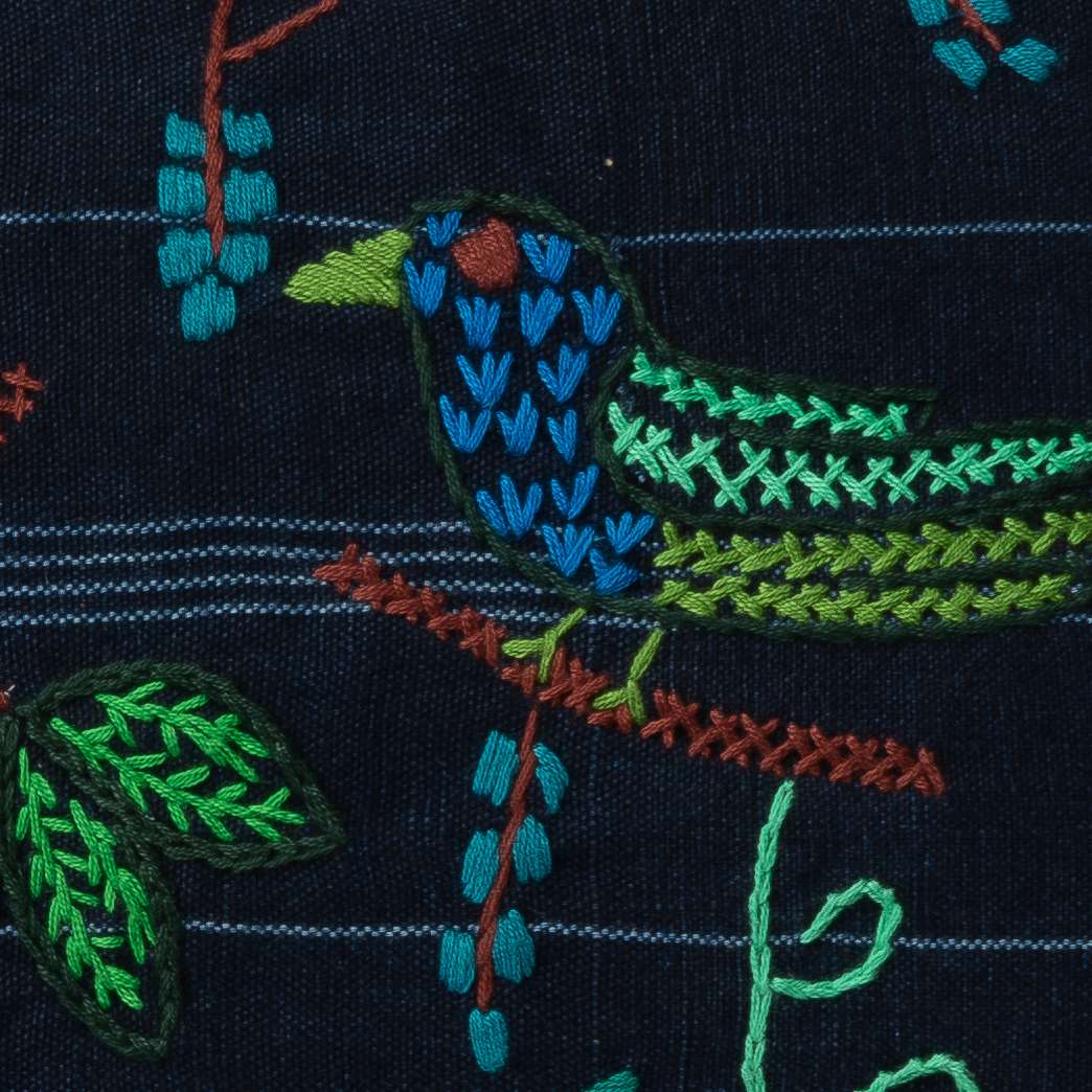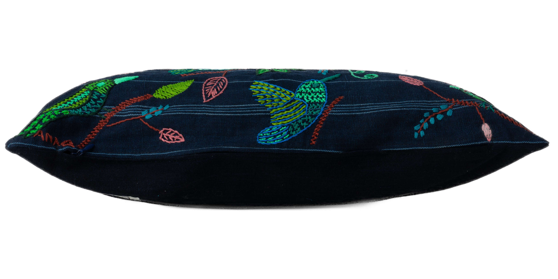 The beautiful embroidery is of whimsical hummingbirds with branches and leaves. There is a variety of stitches in greens, blues, mauve and more on an indigo fabric. The rectangular shape is a good lumbar pillow. Beautiful on the couch or the bed.