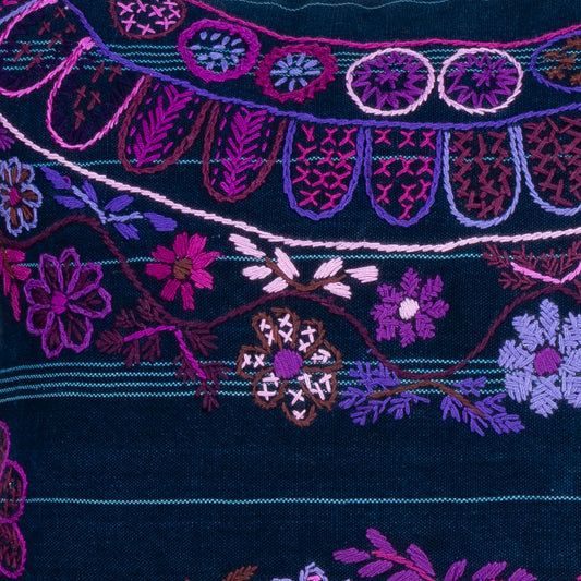 This work of art was designed and hand-stitched by Melina Yol Chiquitó , member of the Sumpango embroidery group. The embroidery is done in a variety of stitches in mostly shades of blue. The design is a combination of birds, geometrics and fauna on a deep indigo fabric. Beautiful on the couch or the bed.
