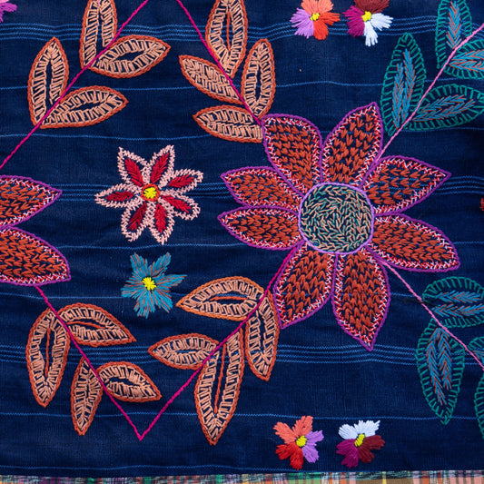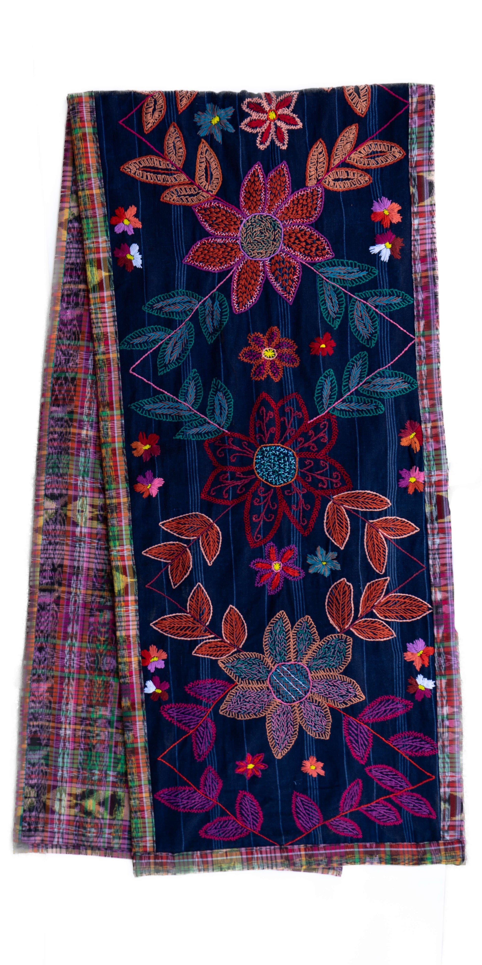 This work of art was designed and hand-stitched by Simeona Lucía Juárez Yax, a member of the Totonicapán embroidery group. The bold floral design is crafted with cotton thread and framed with patterned recycled 'corte' fabric that compliments the embroidery. This table runner is also beautiful as a wall hanging or on the foot of the bed.