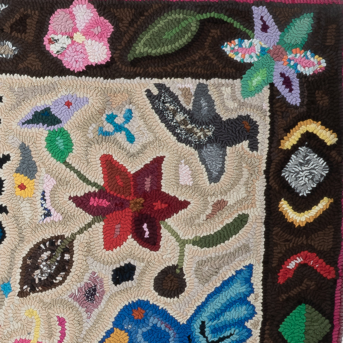This work of art was designed and crafted by Rosario Gutiérrez Pacheco de García, a member of the Chiyax, Totonicapán rug hooking group. This piece is unique, and the design reflects the artist's creative vision.