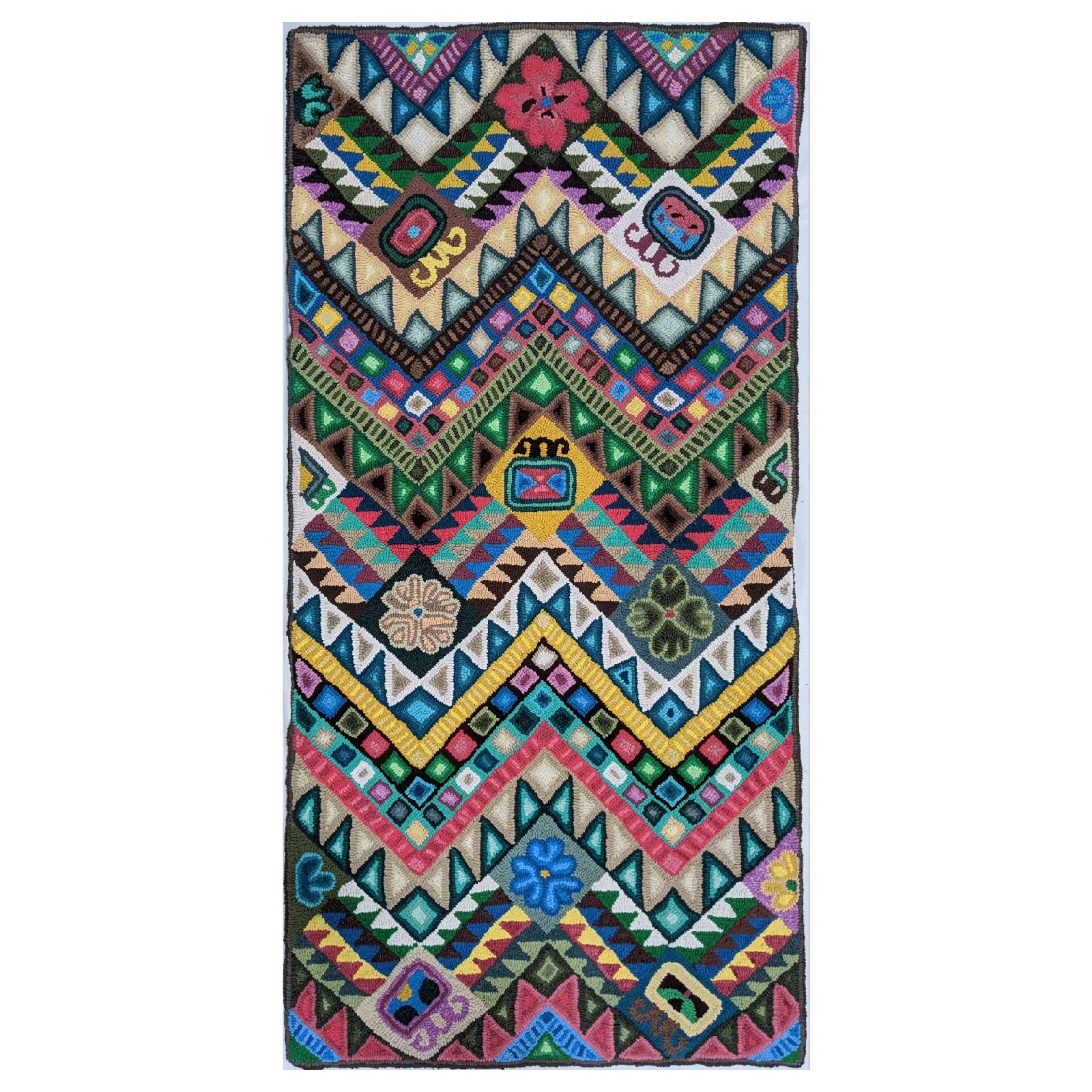 This work of art was designed and crafted by Micaela Churunel Ajú, member of the Chuacruz rug hooking group. This piece is unique and the design is the result of the artist creative vision. Material: Recycled secondhand clothing and cotton base cloth. This artwork was made using 45-50 recycled garments. Care instructions: Spot clean with warm water and mild soap recommended. Shake to remove dust or sand. Vacuum with brush attachment and gentle suction only. Lay flat to dry.