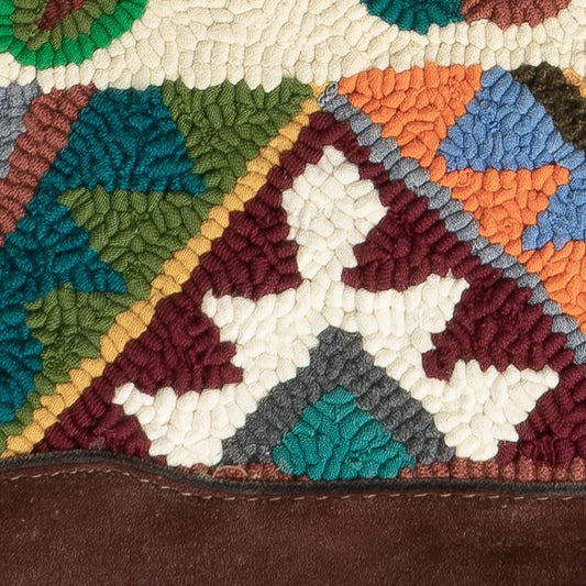 This one of a kind handbag is designed and crafted by Micaela Churunel Ajú, member of the Chuacruz rug hooking group. The combination of flowers and geometrics make a vibrant design. The straps, closure and bottom are soft chocolate brown suede. It is lined with a interior zippered pocket. Zipper closure with magnetic flap.