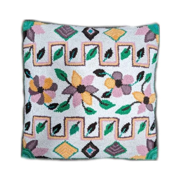 This one of a kind pillow shows Hilda's creativity. The design features flowers, leaves and geometric patterns. White background. Beautiful on the couch or the bed.