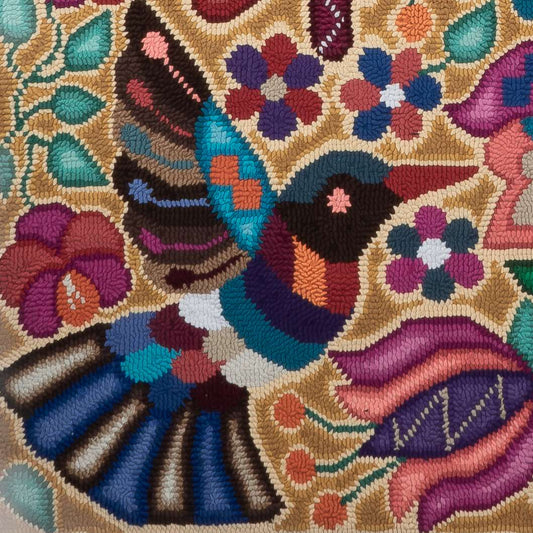 This one of a kind rug shows Lidia's creative vision. The design features colorful birds, butterflies flowers, leaves and branches on a background of pale creamy gold and ochre. This larger size works well in many locations in the home such as by the bed, by the couch, in front of the kitchen sink, and also works as a wall hanging.