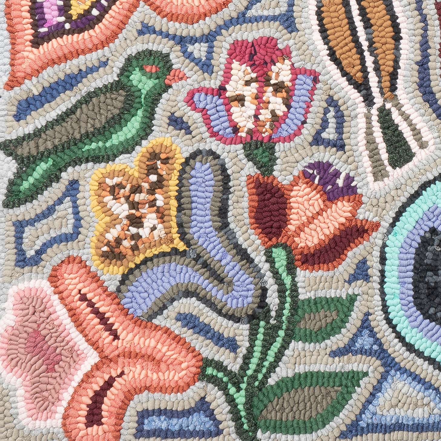 This one of a kind rug shows Bartola's creative vision. The design features birds and flowers on a pale taupe and grey background. The rug is a beautiful wash of pastel colors. This medium size works well in many locations in the home such as by the shower, by the bed or in front of the kitchen sink, and also works as a wall hanging.