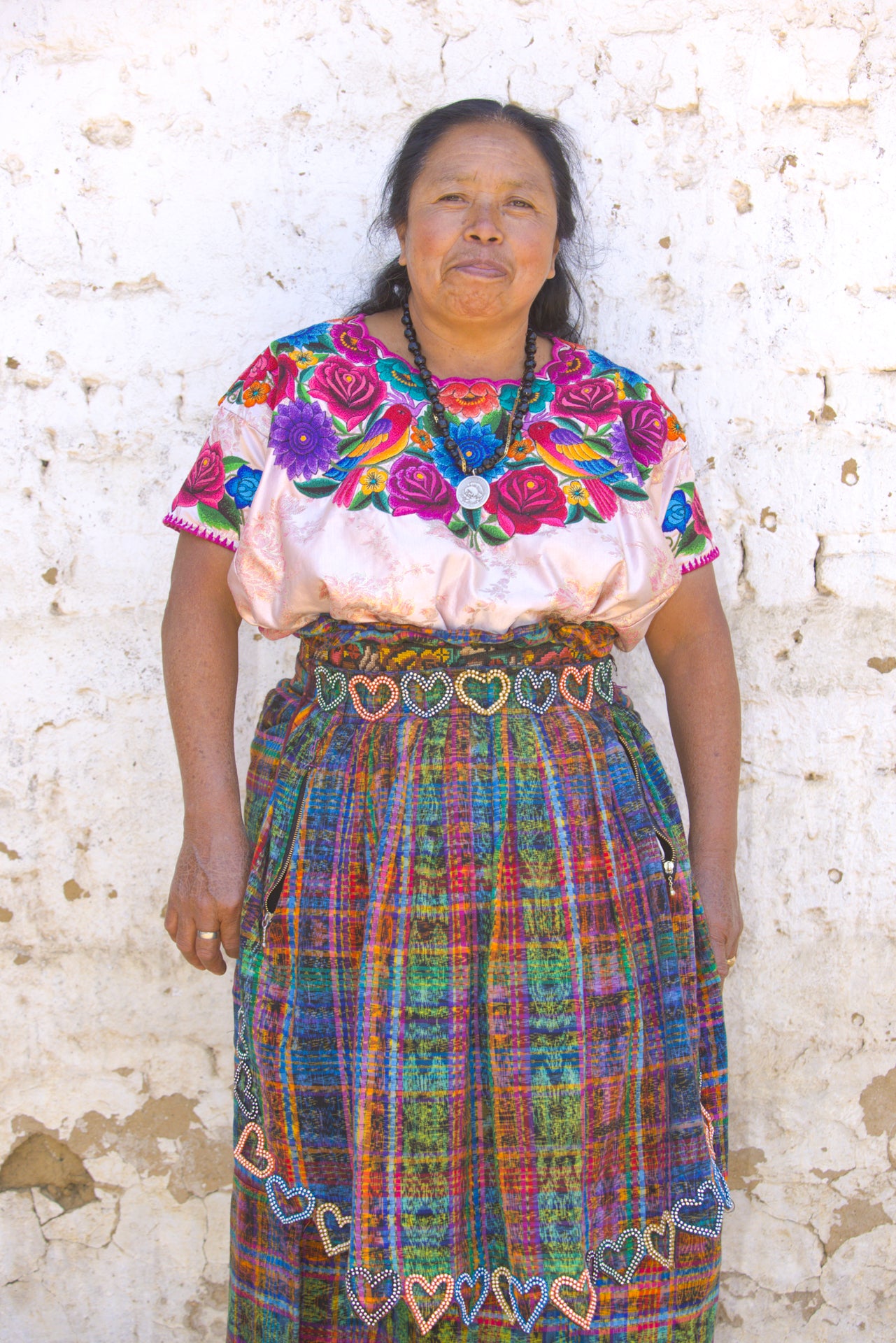 This one of a kind handbag is designed and crafted by Maria Sacalxot Coti, a member of the Chirijquiac rug hooking group. The straps, closure and bottom are soft suede. It is lined with a interior zippered pocket. Zipper closure with magnetic flap.