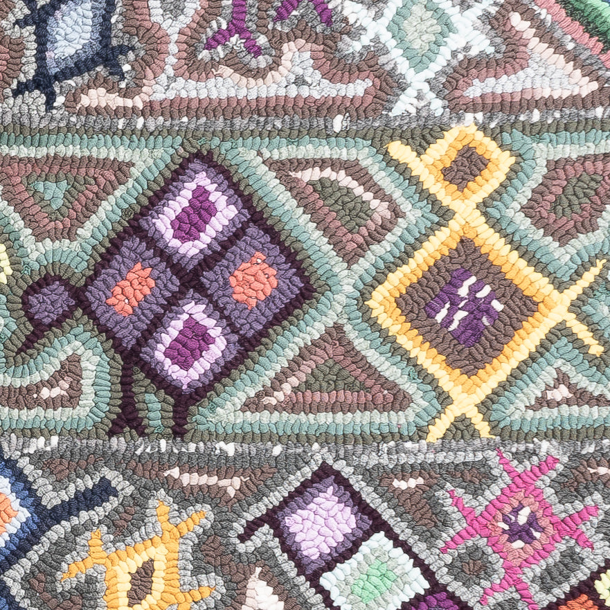 This one of a kind rug shows Bartola's creative vision. The design features geometric animals on a pale taupe and brown. The rug is a beautiful wash of pastel colors. This large size works well in many locations in the home such as by the shower, by the bed or in front of the kitchen sink, and also works as a wall hanging.