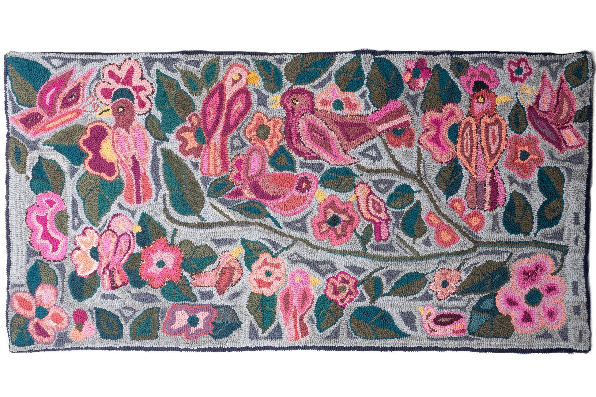 This one of a kind rug shows Juana's creative vision. The design features colorful birds, flowers, leaves and branches. This larger size works well in many locations in the home such as by the bed, by the couch, in front of the kitchen sink, and also works as a wall hanging.