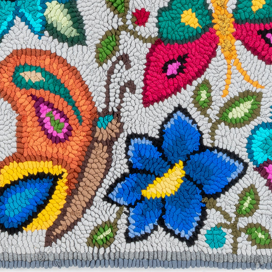 This work of art was designed and crafted by Irma Raquel Churunel Ajú, member of the Chuacruz rug hooking group. This piece is unique and the design is the result of the artist's creative vision.