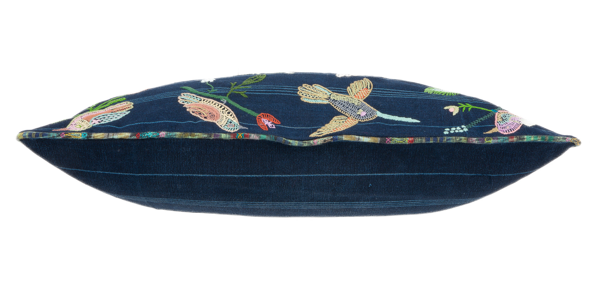 The embroidery is done in a variety of stitches in mostly shades of green. The design is a combination of birds, geometrics and fauna on a deep indigo fabric. Beautiful on the couch or the bed.
