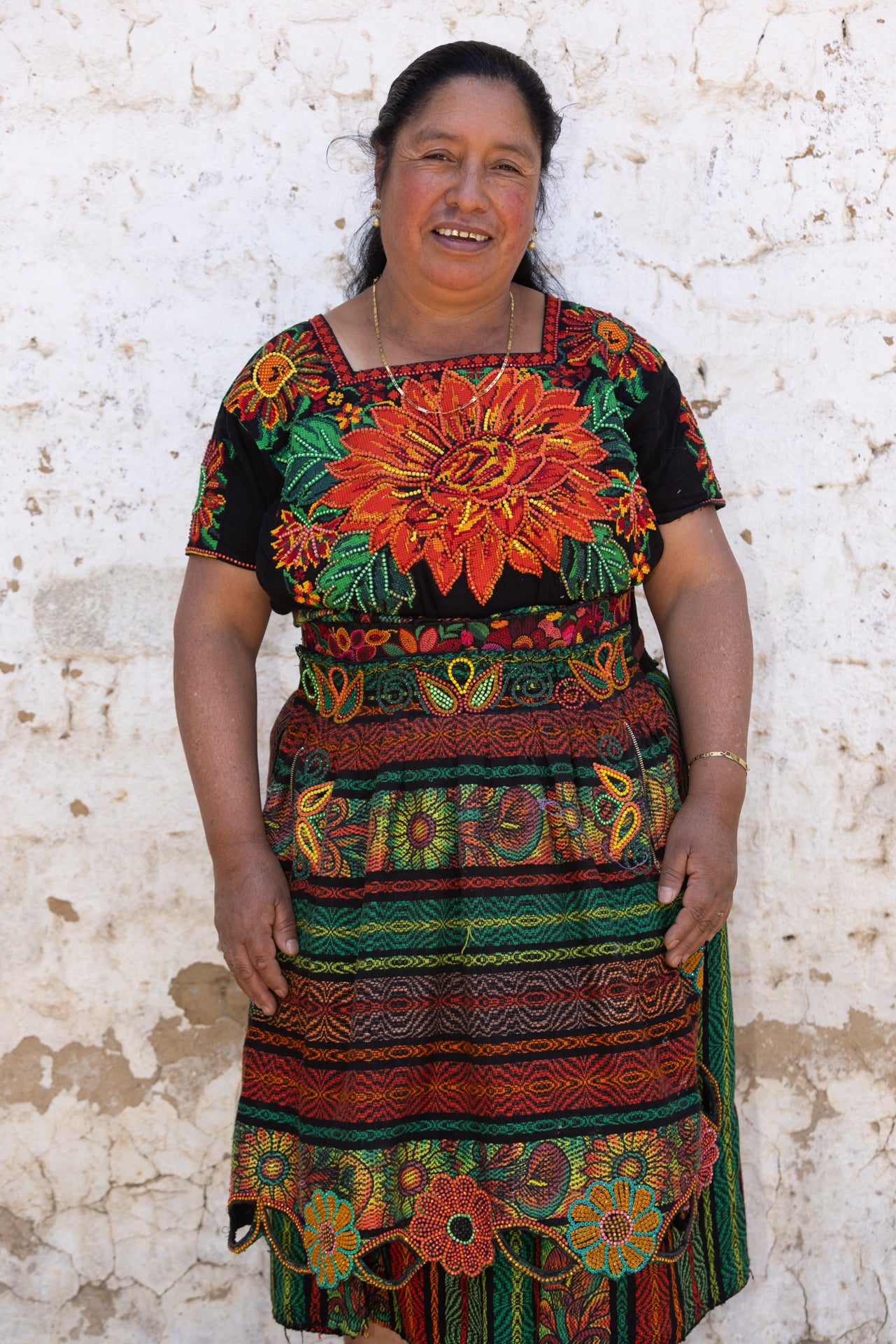 My work represents my greatest medicine: the joy of seeing and living life. In my portrait, I am shown with a genuine smile, appreciating my surroundings—the flowers, the birds, and the colors of my beautiful Guatemala.