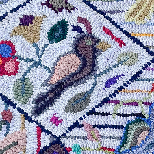 This work of art was designed and crafted by Hilda Raquel García Tzunún de Tumax, member of the Totonicapán rug hooking group. This piece is unique, and the design is the result of the artist’s creative vision.