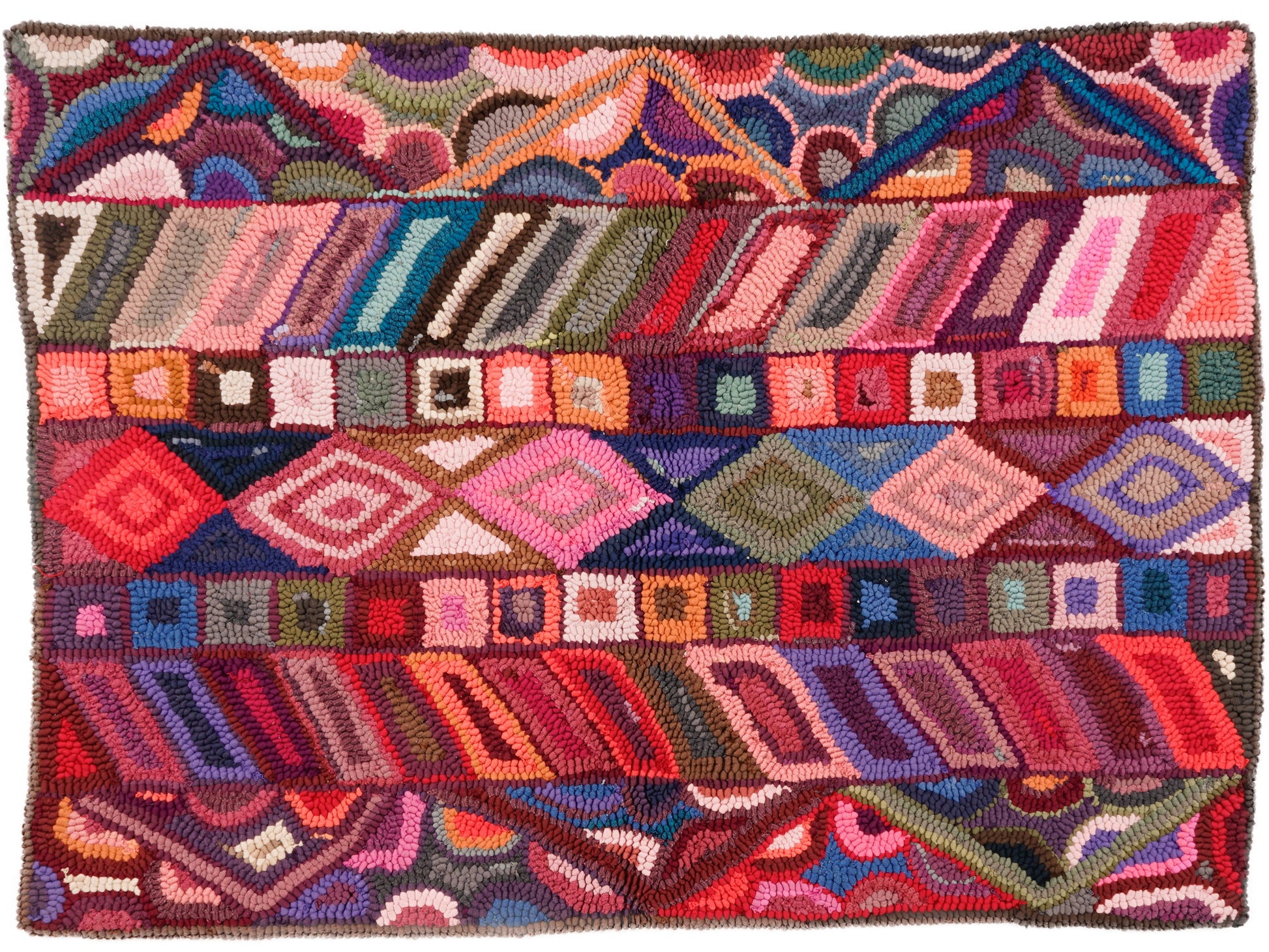This work of art was designed and crafted by Glendy Emiliana Muj Mendoza, member of the Patanatic rug hooking group. This piece is unique and the design is the result of the artist’s creative vision.