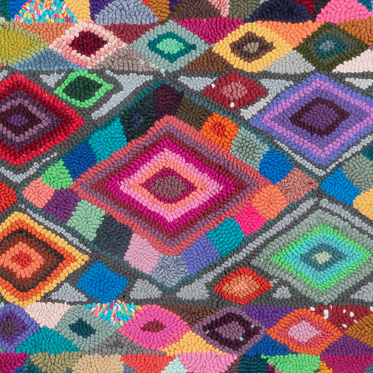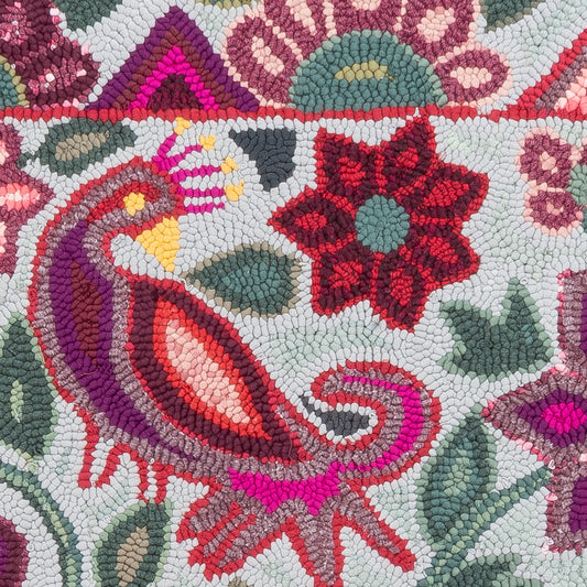This work of art was designed and crafted by Juana Calel Yax de González, member of the Patanatic rug hooking group.This piece is unique and the design is the result of the artist creative vision.