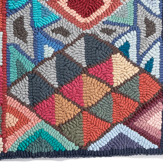 The geometry reference the huipil from Chichicastenango, It’s multicolored because of the different outfits that Mayan women wear. This larger size works well in many locations in the home such as by the bed, by the couch, in front of the kitchen sink, and also works as a wall hanging.
