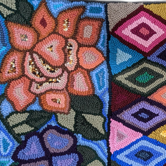 This work of art was designed and crafted by Irma Elizabeth de Léon Vargas de Sazo member of the Patanatic rug hooking group. This piece is unique and the design is the result of the artist creative vision.