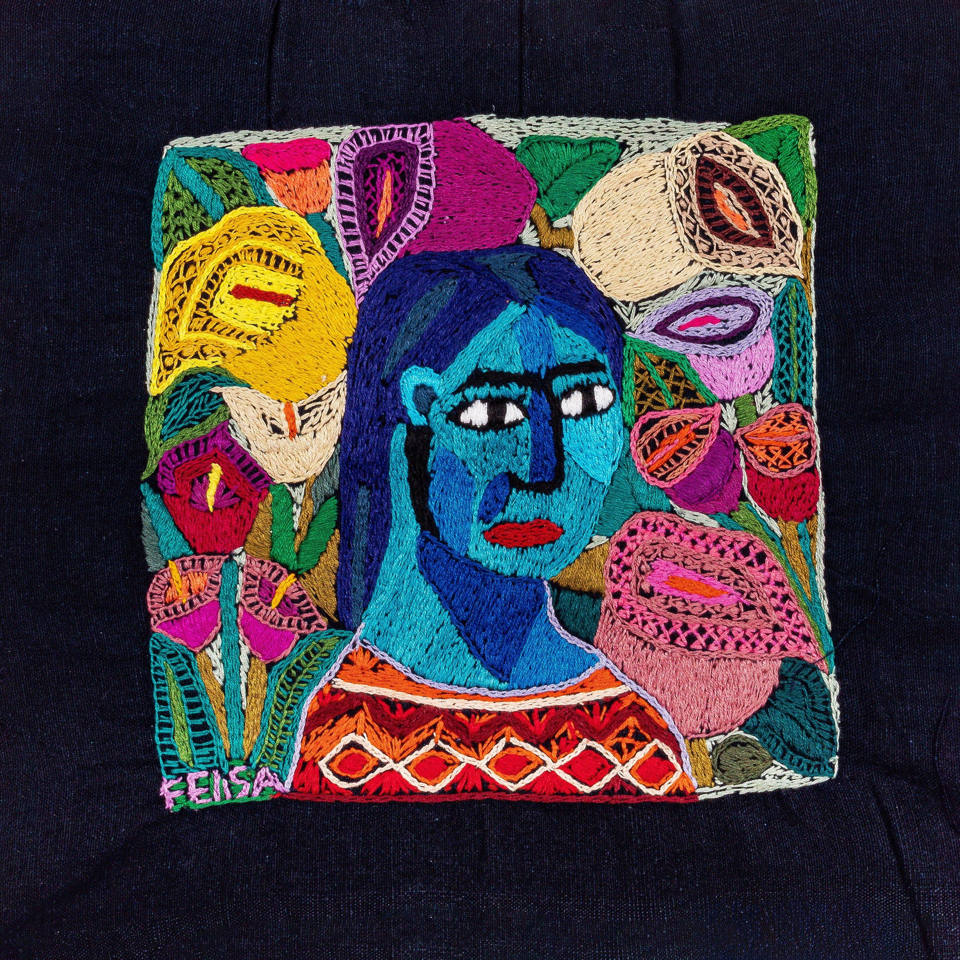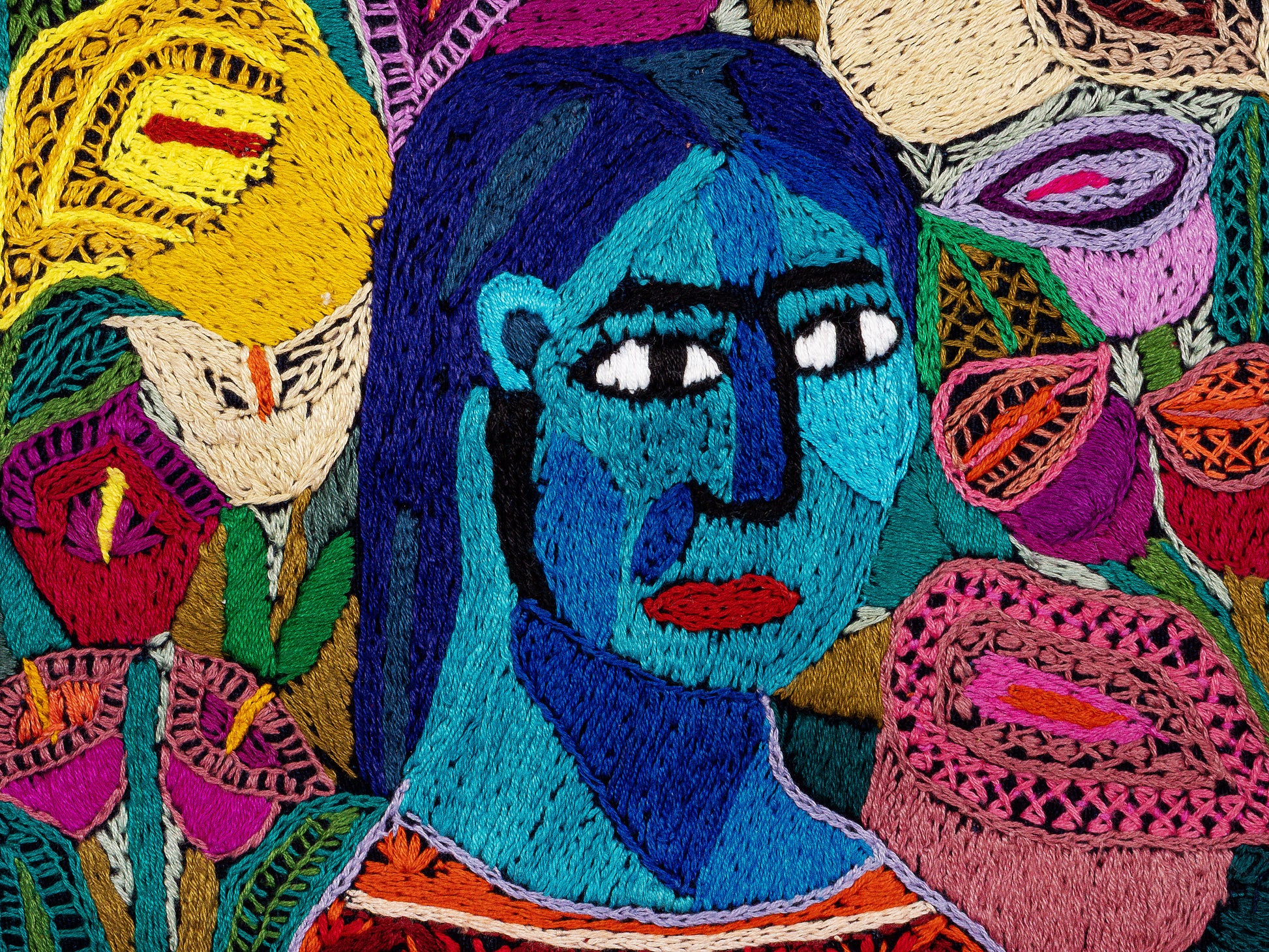 Amid the calla lilies, I appear with blue skin, a metaphor I used to evoke feelings of calm and serenity—emotional states I experienced while embroidering my portrait. At this stage of my life, I am a happy and peaceful grandmother, dedicated to enjoying my grandchildren and sharing that God is love.