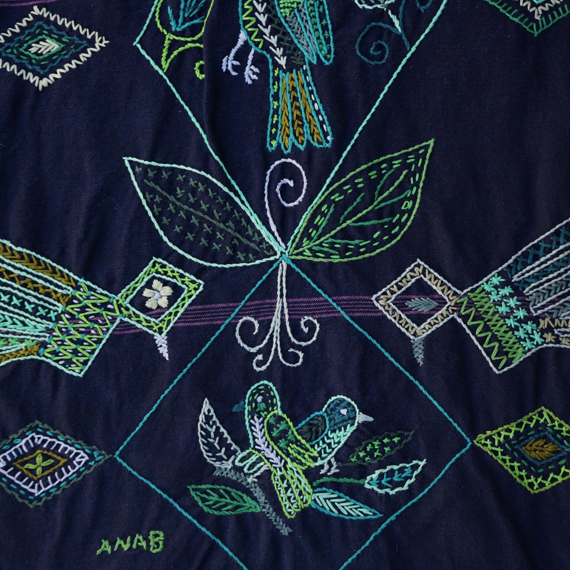 "Embroidered designs of birds in geometric patterns that represent the nature of Guatemala and its traditional clothing."